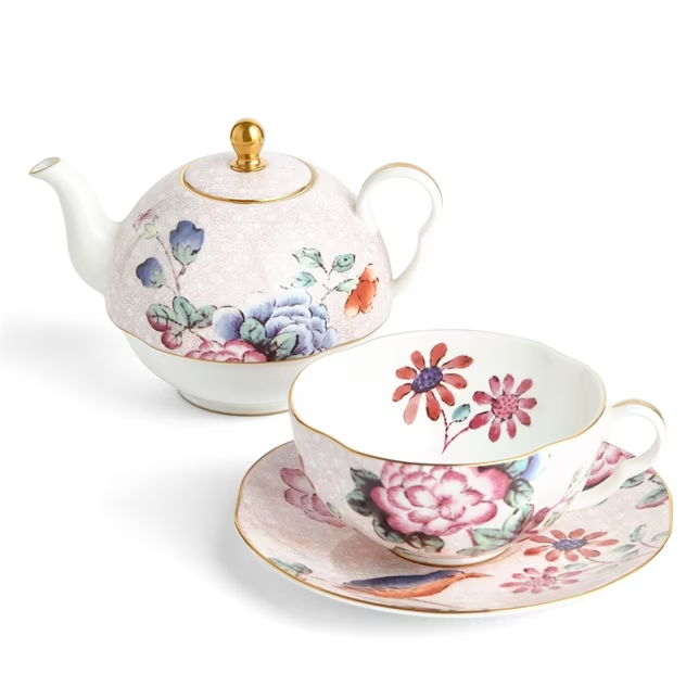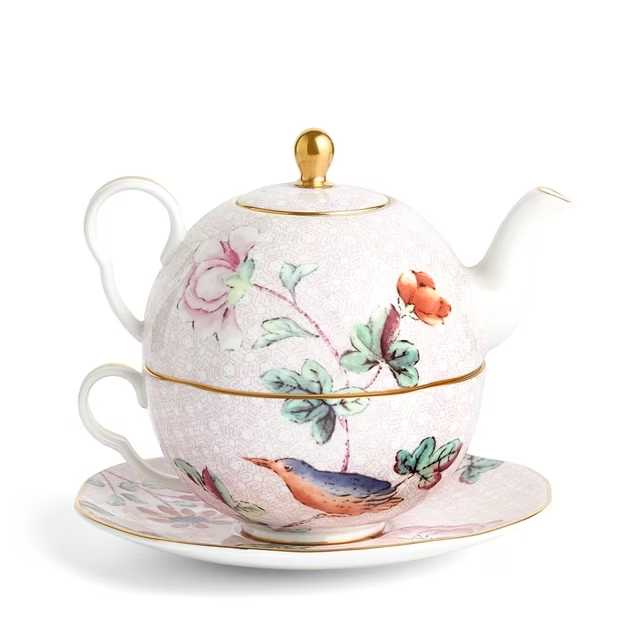 Designed in fine bone china and finished to the highest quality, the ingenious Cuckoo Tea for One cleverly combines teapot, teacup and saucer in one for the perfect cup of tea or infusion. Originally inspired by beautifully vivid birds and gorgeous, colorful Chinese flowers taken from historical Wedgwood pattern archives dating back to the early 19th century, the sophisticated Cuckoo pattern was revived in 1973. The generous blooms in pink, blue and orange with their delicate green foliage are beautifully depicted alongside the whimsical cuckoo bird and highlighted with 24 karat gold gilding for a touch of pure luxury. Presented in an elegant Wedgwood blue gift box it makes the ideal gift for tea lovers, complementing the other exquisite teaware pieces in the Cuckoo collection. Together, they create a stunning, colorful display for a perfect afternoon tea in the finest English tradition.